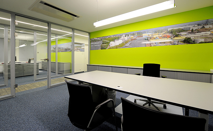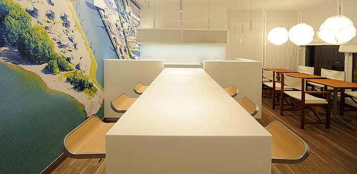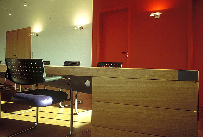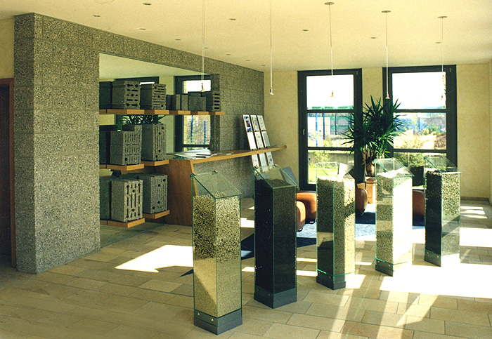 So kann man sagen, dass das Gesamtprojekt aus einem Guss entstanden ist, ein Idealfall! Von Empfang, Wartezone, Produktpräsentation, mit Integrieren des hauseigenen Rohstoffes Bims als Gestaltungsmittel und Akustikmaßnahme, über Kaffeetheke, Konferenzraum mit Eigenentwurf des Konferenztisches und Multimediaeinbauwand, bis zum Chefbüro, zieht sich eine zeitlos, klassisch Linie durch, das Gebäude, lichtdurchflutete, freundliche Räume, mit der Verkörperung von Bodenständigkeit und Langlebigkeit, passend zum Produkt und Bauherrenwunsch.