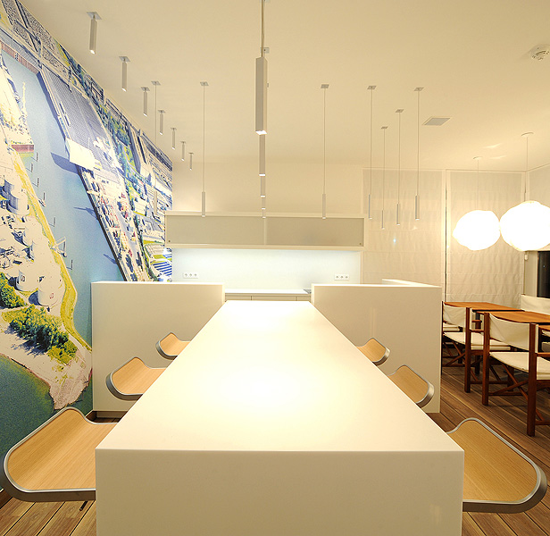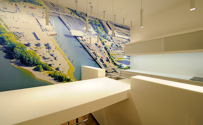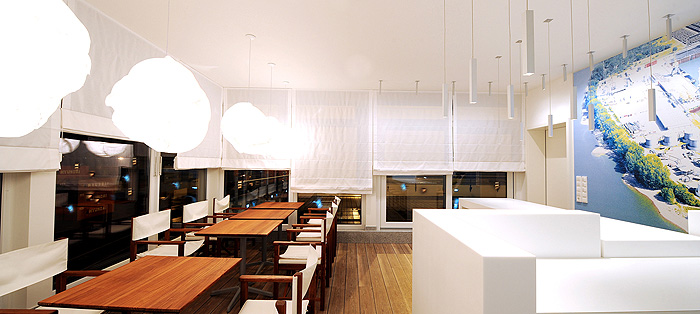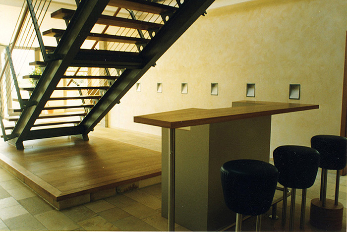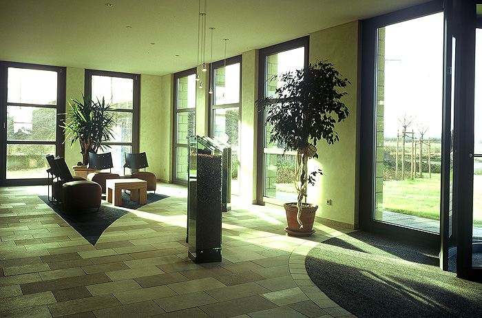 So kann man sagen, dass das Gesamtprojekt aus einem Guss entstanden ist, ein Idealfall! Von Empfang, Wartezone, Produktpräsentation, mit Integrieren des hauseigenen Rohstoffes Bims als Gestaltungsmittel und Akustikmaßnahme, über Kaffeetheke, Konferenzraum mit Eigenentwurf des Konferenztisches und Multimediaeinbauwand, bis zum Chefbüro, zieht sich eine zeitlos, klassisch Linie durch, das Gebäude, lichtdurchflutete, freundliche Räume, mit der Verkörperung von Bodenständigkeit und Langlebigkeit, passend zum Produkt und Bauherrenwunsch.